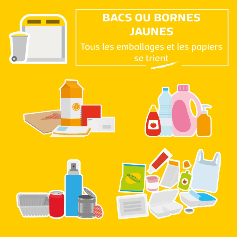 La collecte des déchets recyclables (bac jaune) a lieu tous les jeudis matin, tous les quinze jours, les semaines paires. Pensez à bien trier vos déchets pour faciliter le recyclage.